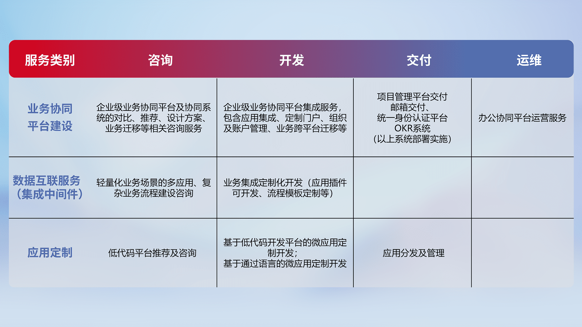 针对钉钉、、企微、、IDaas等平台级产品提供产品的规划、、、方案、、交付、、、定制化开发等服务,,,实现如统一协同办公、、、智能客户服务、、、混合会议管理、、、、智能数据查询、、、、等业务场景,,实现数字化转型。。